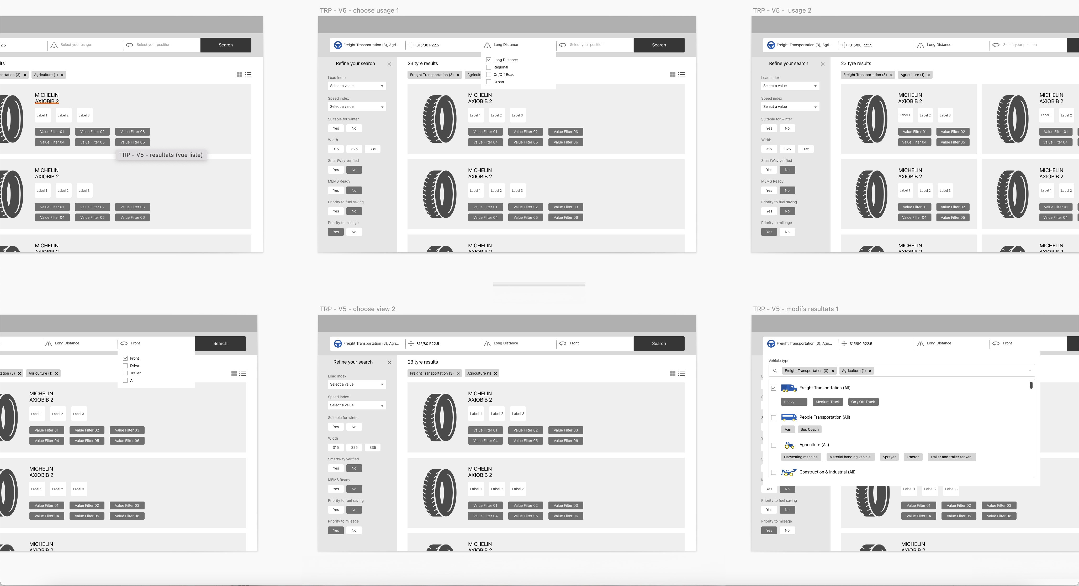 Le démarrage du projet s'est appuyé sur un double exercice d'audit et de co-conception avec les équipes UX/UI de Michelin. Premier objectif : créer des templates et landing pages pour chaque univers B2B, optimiser le parcours de recherche de pneus (Tyre Selector, Dealer Locator) avec points d’entrées, parcours, résultats et système de filtres. Chaque template a fait l'objet d'un nouveau design, avec cinq breakpoints et une approche "Mobile First" ! La section "Tyre Detail", sorte de fiche technique du pneu, a été l'étape-clé de cette refonte, avec plus de 60 pages individuelles de pneus Michelin à répertorier et designer. Toutes les deux semaines, chaque session UX/UI s'est déroulée de manière collaborative et itérative avec les équipes de Michelin Digital, à réception du Flash Point (planning) et jusqu'aux Milestones. En parallèle, le Design System s'est créé progressivement, avec plusieurs objectifs : standardiser les calques en symboles, styles dynamiques, styles de texte, classifier les atomes/composants et ainsi créer une librairie adaptative aux deux plateformes du Groupe.